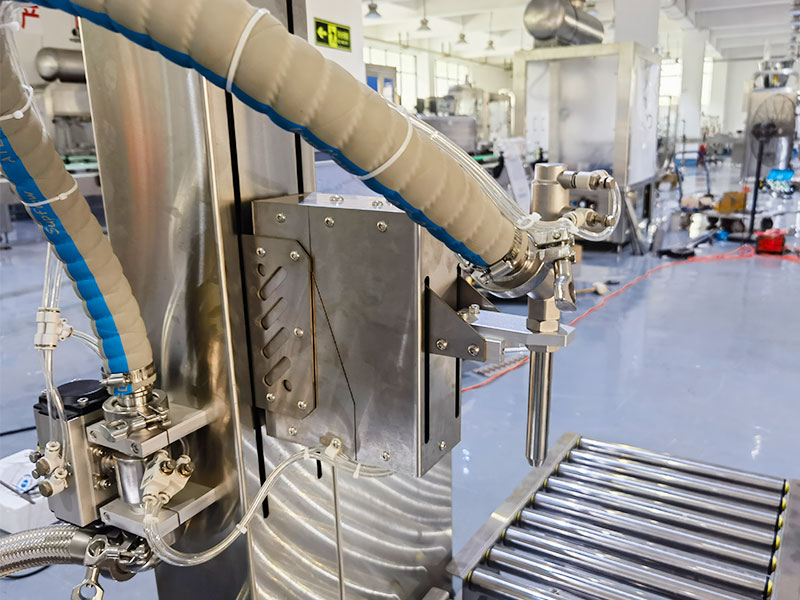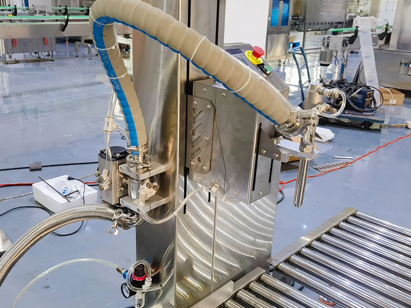 大型化工液體灌裝設(shè)備主要由自動化控制系統(tǒng)執(zhí)行,工作人員將空桶防止在輸送帶上,開啟綠色灌裝按鈕,光電傳感裝置在檢測到灌裝桶到位時(shí),氣動夾具自動夾緊,系統(tǒng)開始自動扣除空桶重量,進(jìn)行去皮處理,大型化工液體灌裝設(shè)備將會進(jìn)入灌裝準(zhǔn)備狀態(tài),灌裝頭開始插入容器桶內(nèi),打開防爆電磁閥,物料順著流入桶內(nèi),稱重感應(yīng)裝置將實(shí)時(shí)反饋重量信息的變化,便于工作人員查詢,PLC控制閥門將會實(shí)現(xiàn)快、慢速切換模式,以此達(dá)到灌裝精度的準(zhǔn)確,充填結(jié)束后,閥門關(guān)閉,灌裝頭回吸并提升,隨之進(jìn)入旋蓋工位,振動盤則把需要封蓋的容器逐一上蓋,機(jī)械臂抓蓋,伺服旋蓋頭將按預(yù)設(shè)扭矩完成旋蓋任務(wù)。